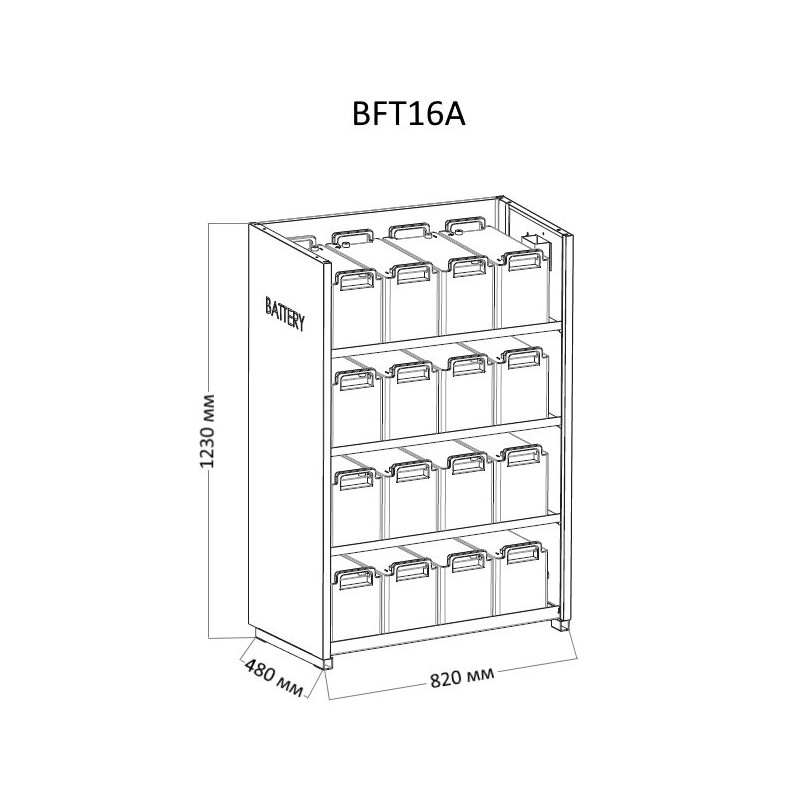 Батарейный шкаф BFT16A. Габариты корпуса (ШхВхГ) - 480 х 1230 х 820 мм, кол-во уровней = 4, макс. кол-во АКБ 75Ач до 28 шт